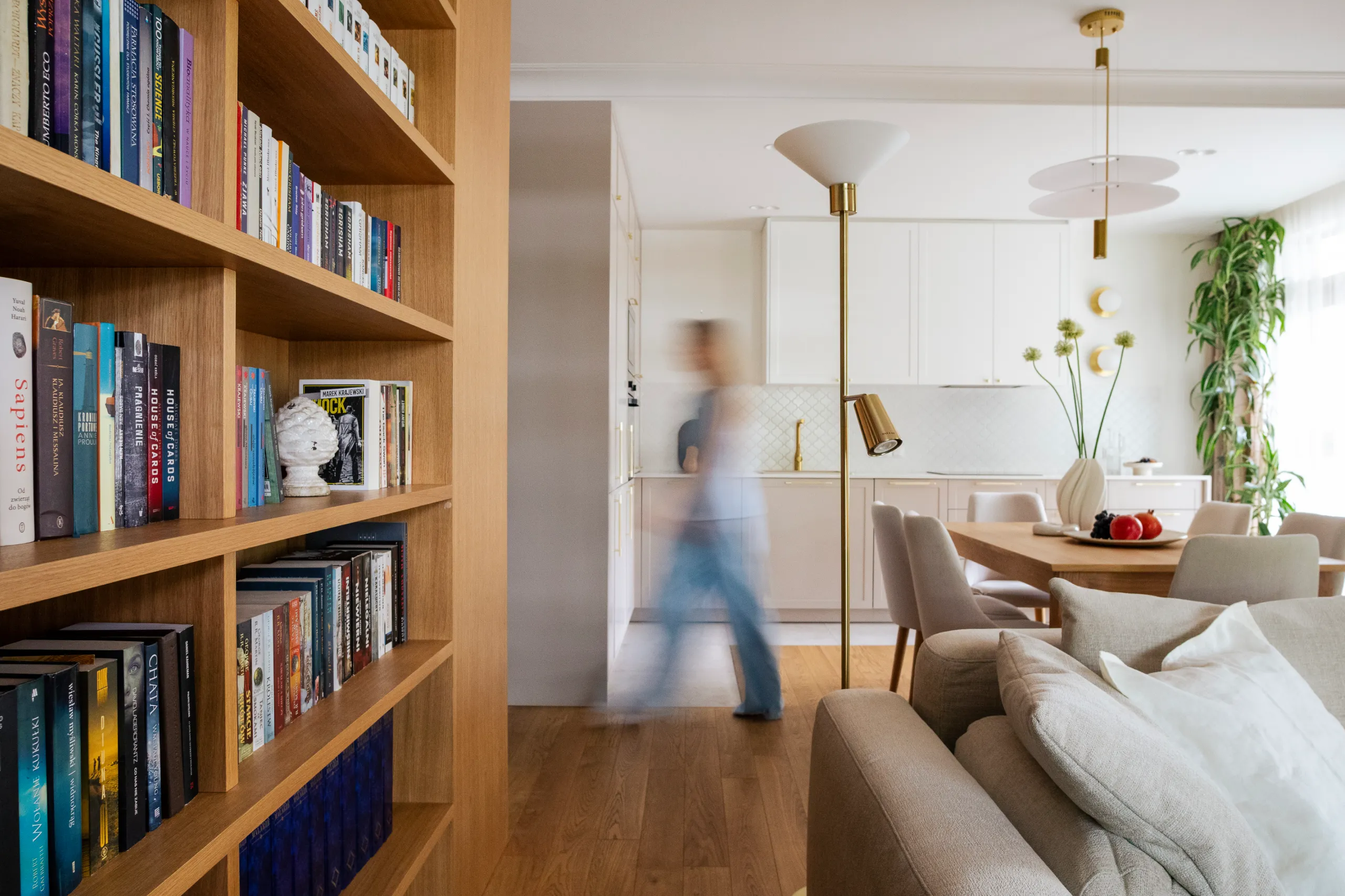 Stumetrowe mieszkanie w Warszawie, w którym biblioteka pełni rolę głównego elementu aranżacyjnego. Projekt łączący stonowaną kolorystykę, naturalne materiały i przemyślane rozwiązania funkcjonalne.