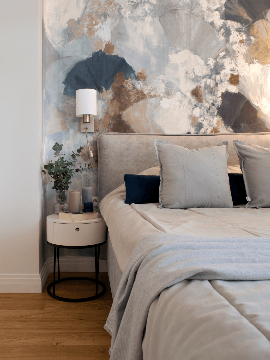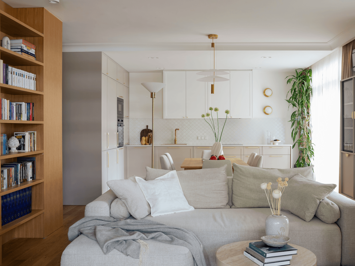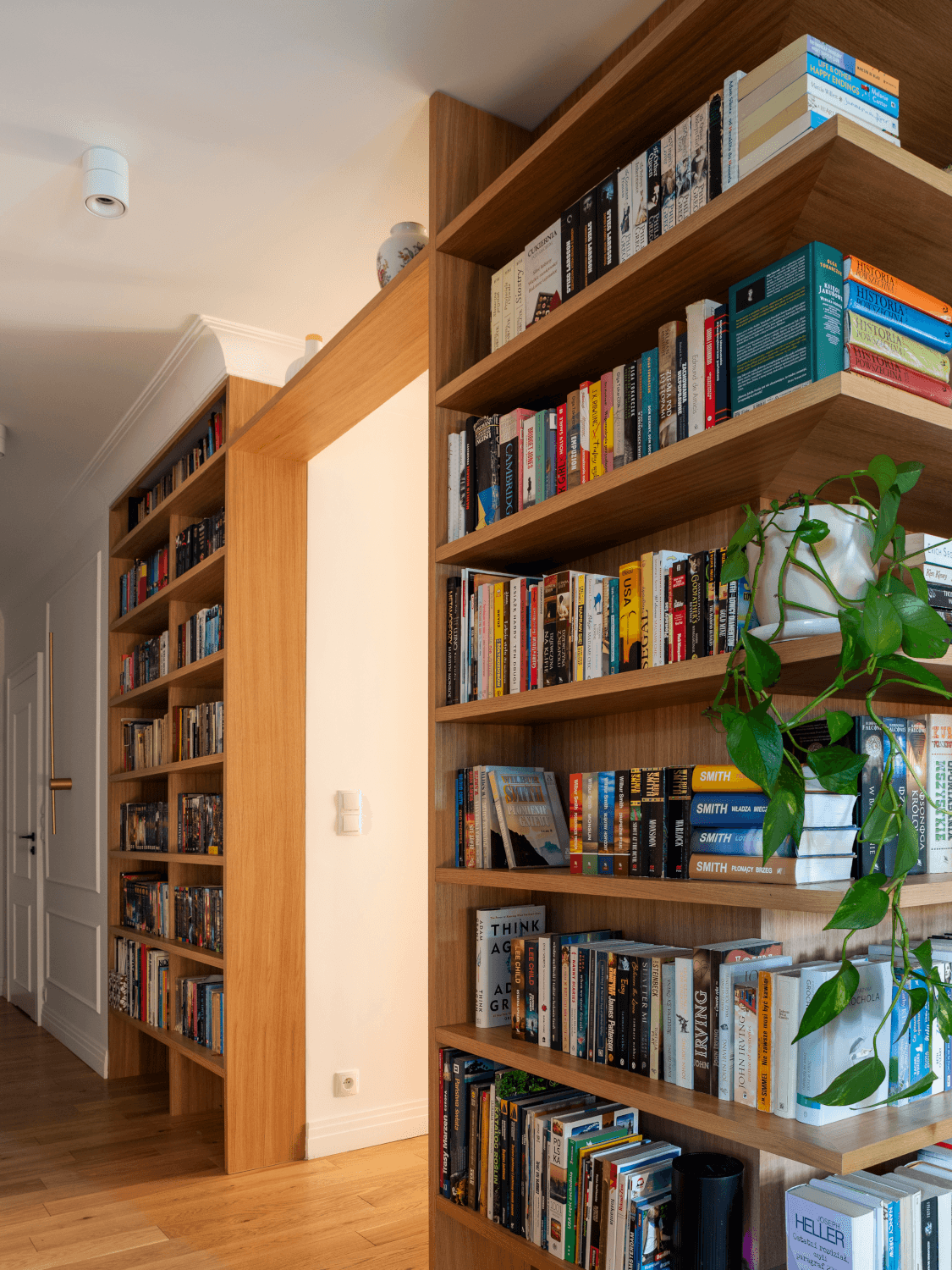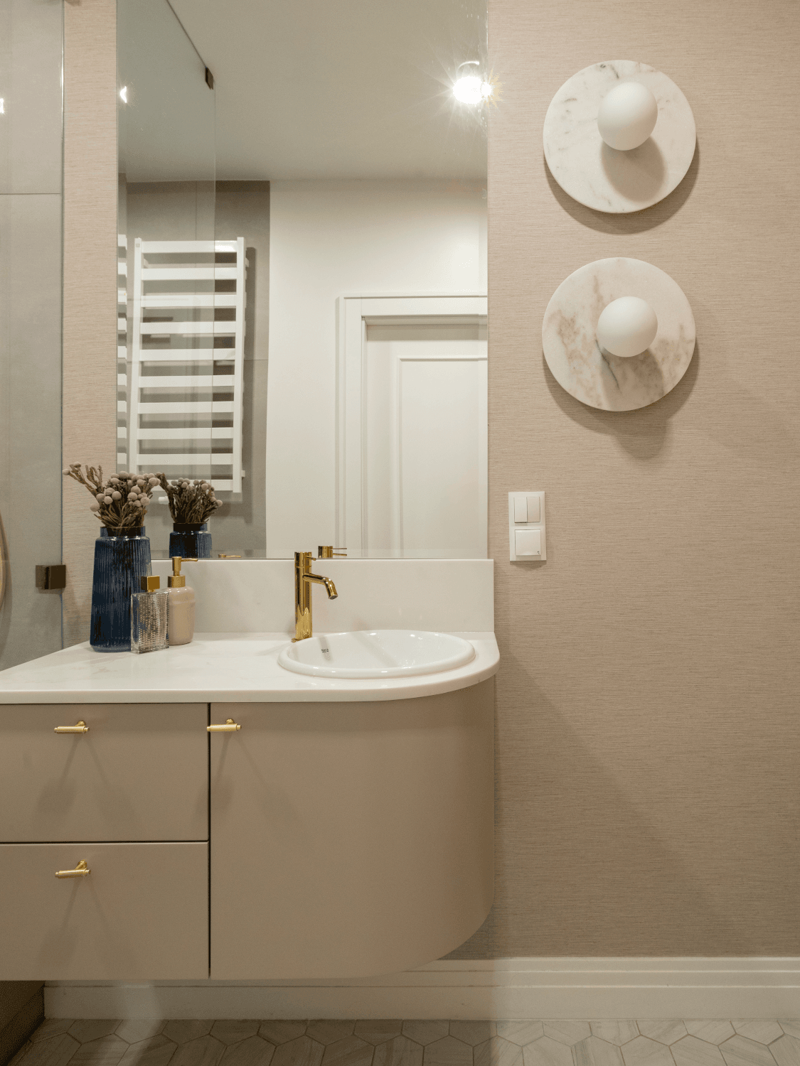 Wnętrze bazuje na szlachetnych, naturalnych materiałach. Ciepła, drewniana podłoga i fornirowane zabudowy meblowe budują przytulną atmosferę, stanowiąc solidną bazę aranżacji. Charakteru dodają tu pastelowe wykończenia oraz biżuteryjne, złote detale, które wprowadzają nutę dyskretnego luksusu. Całość to ponadczasowa, elegancka kompozycja, która idealnie współgra ze światłem wpadającym przez duże okna. To realizacja, która udowadnia, jak kompleksowy projekt potrafi połączyć funkcjonalność z estetyką, tworząc azyl w sercu Warszawy.
