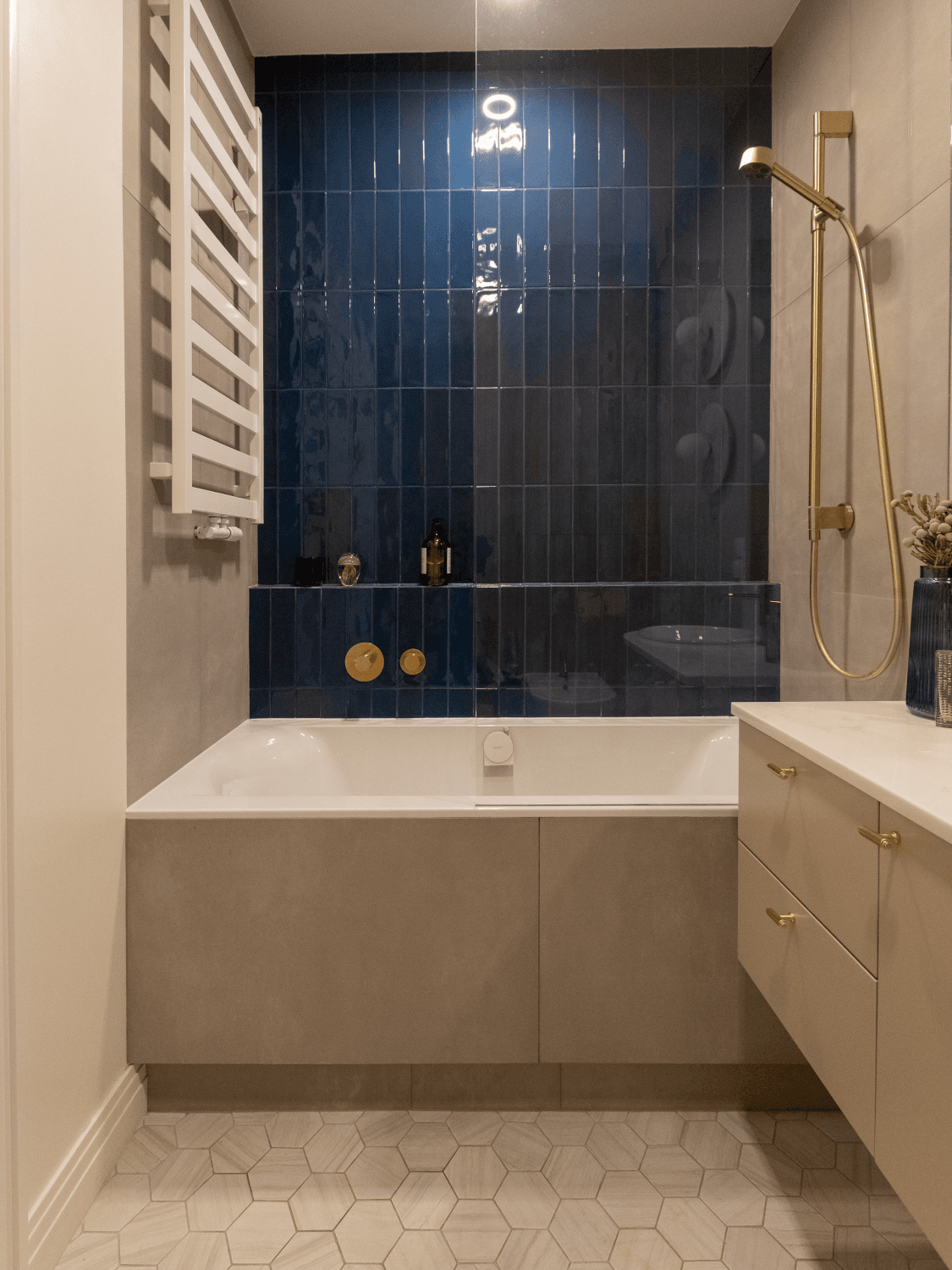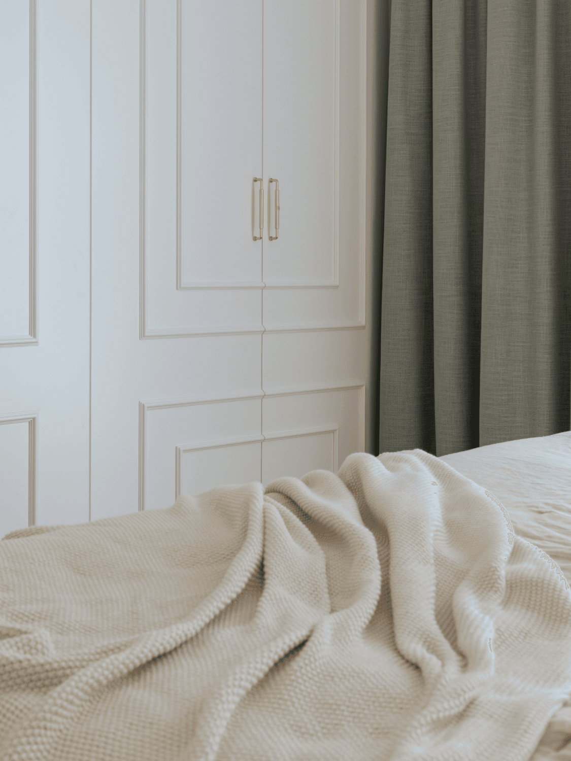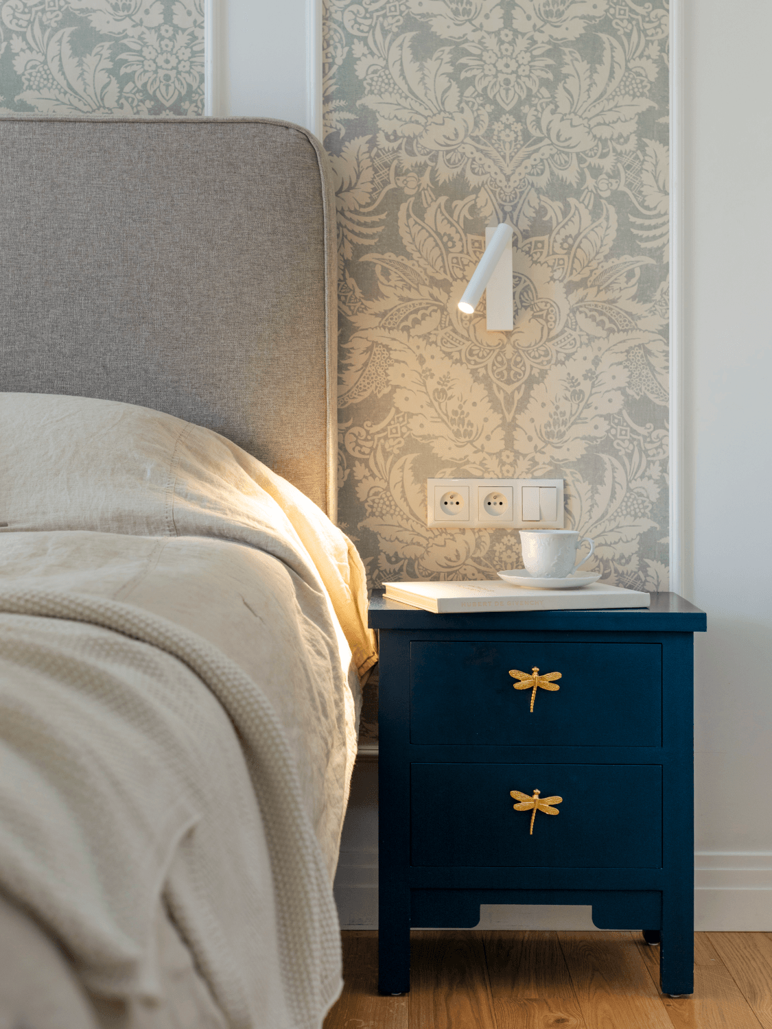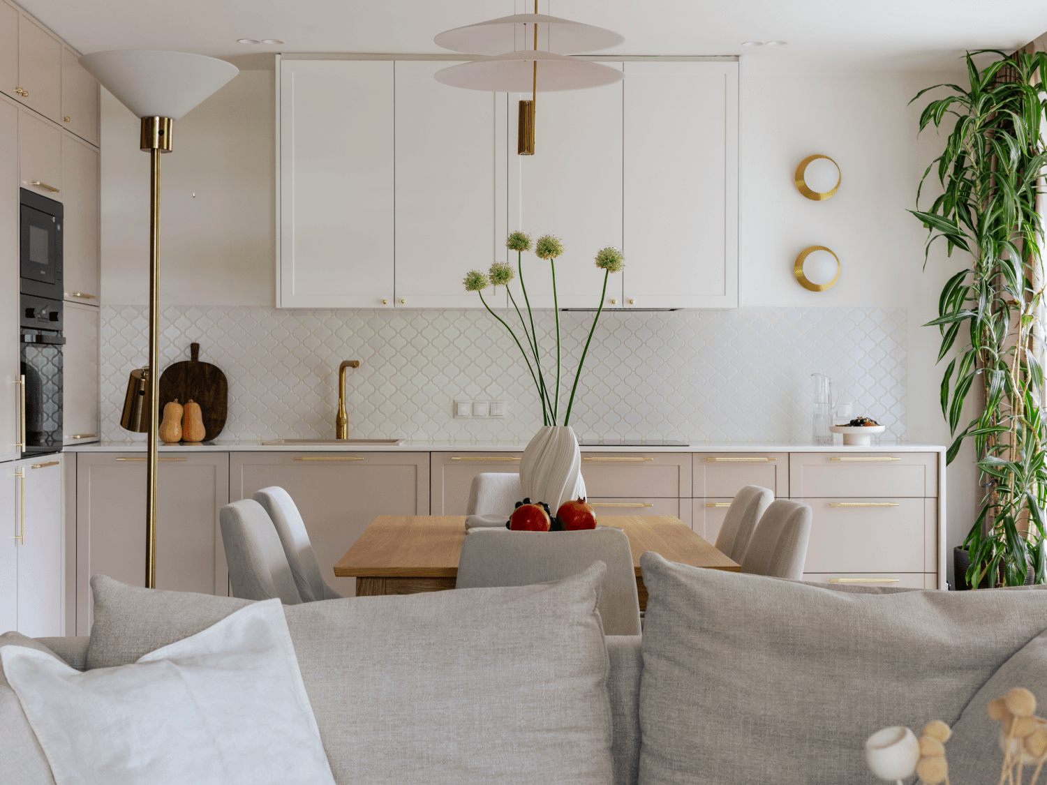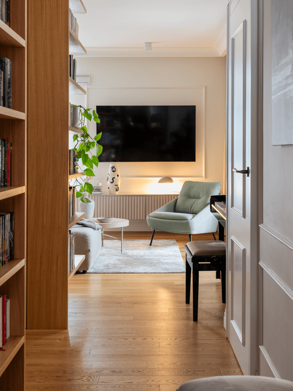 Wnętrze bazuje na szlachetnych, naturalnych materiałach. Ciepła, drewniana podłoga i fornirowane zabudowy meblowe budują przytulną atmosferę, stanowiąc solidną bazę aranżacji. Charakteru dodają tu pastelowe wykończenia oraz biżuteryjne, złote detale, które wprowadzają nutę dyskretnego luksusu. Całość to ponadczasowa, elegancka kompozycja, która idealnie współgra ze światłem wpadającym przez duże okna. To realizacja, która udowadnia, jak kompleksowy projekt potrafi połączyć funkcjonalność z estetyką, tworząc azyl w sercu Warszawy.