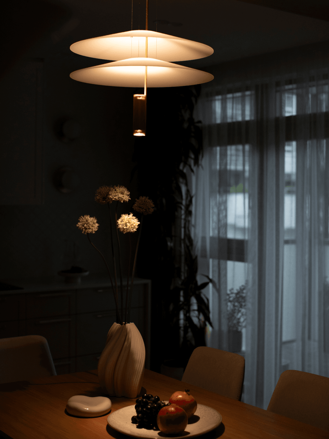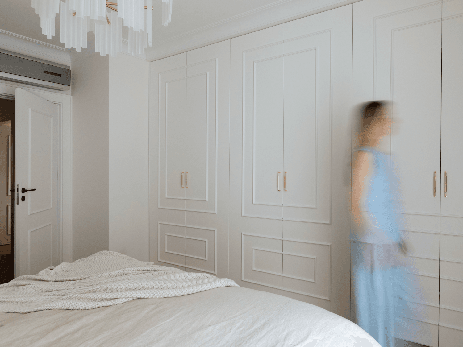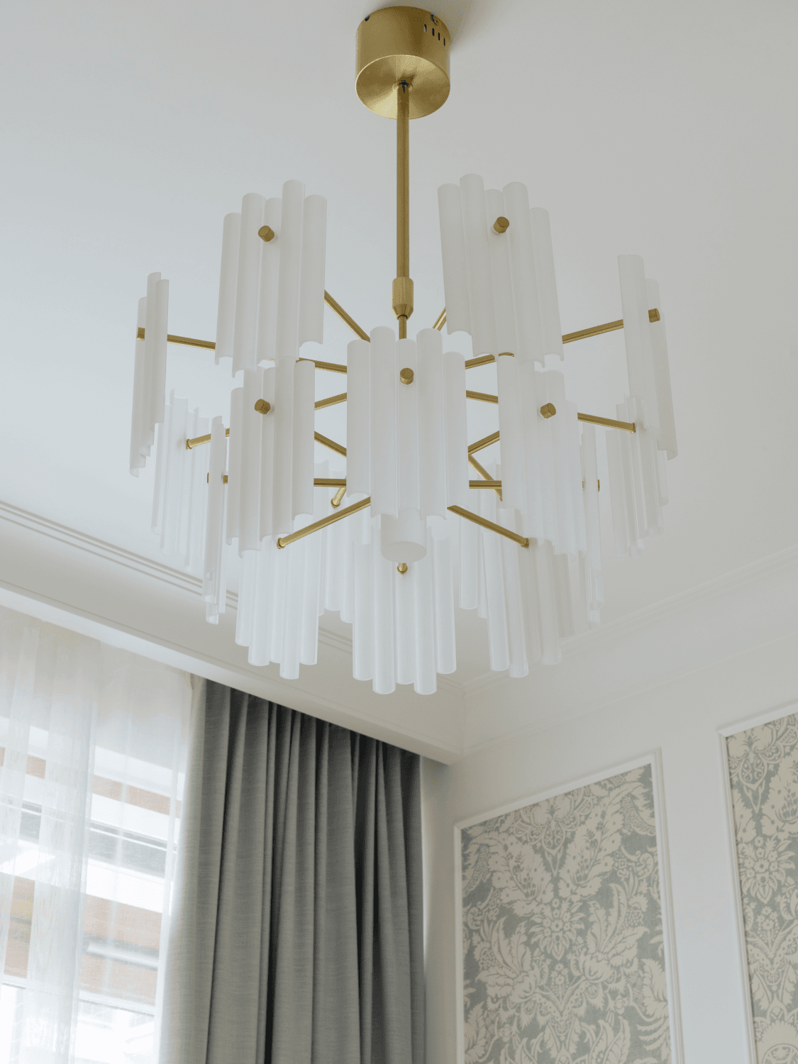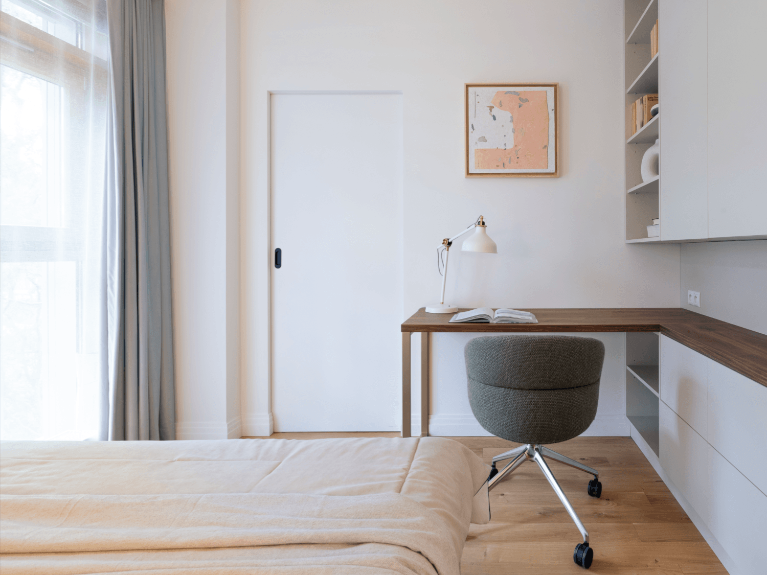 Wnętrze bazuje na szlachetnych, naturalnych materiałach. Ciepła, drewniana podłoga i fornirowane zabudowy meblowe budują przytulną atmosferę, stanowiąc solidną bazę aranżacji. Charakteru dodają tu pastelowe wykończenia oraz biżuteryjne, złote detale, które wprowadzają nutę dyskretnego luksusu. Całość to ponadczasowa, elegancka kompozycja, która idealnie współgra ze światłem wpadającym przez duże okna. To realizacja, która udowadnia, jak kompleksowy projekt potrafi połączyć funkcjonalność z estetyką, tworząc azyl w sercu Warszawy.